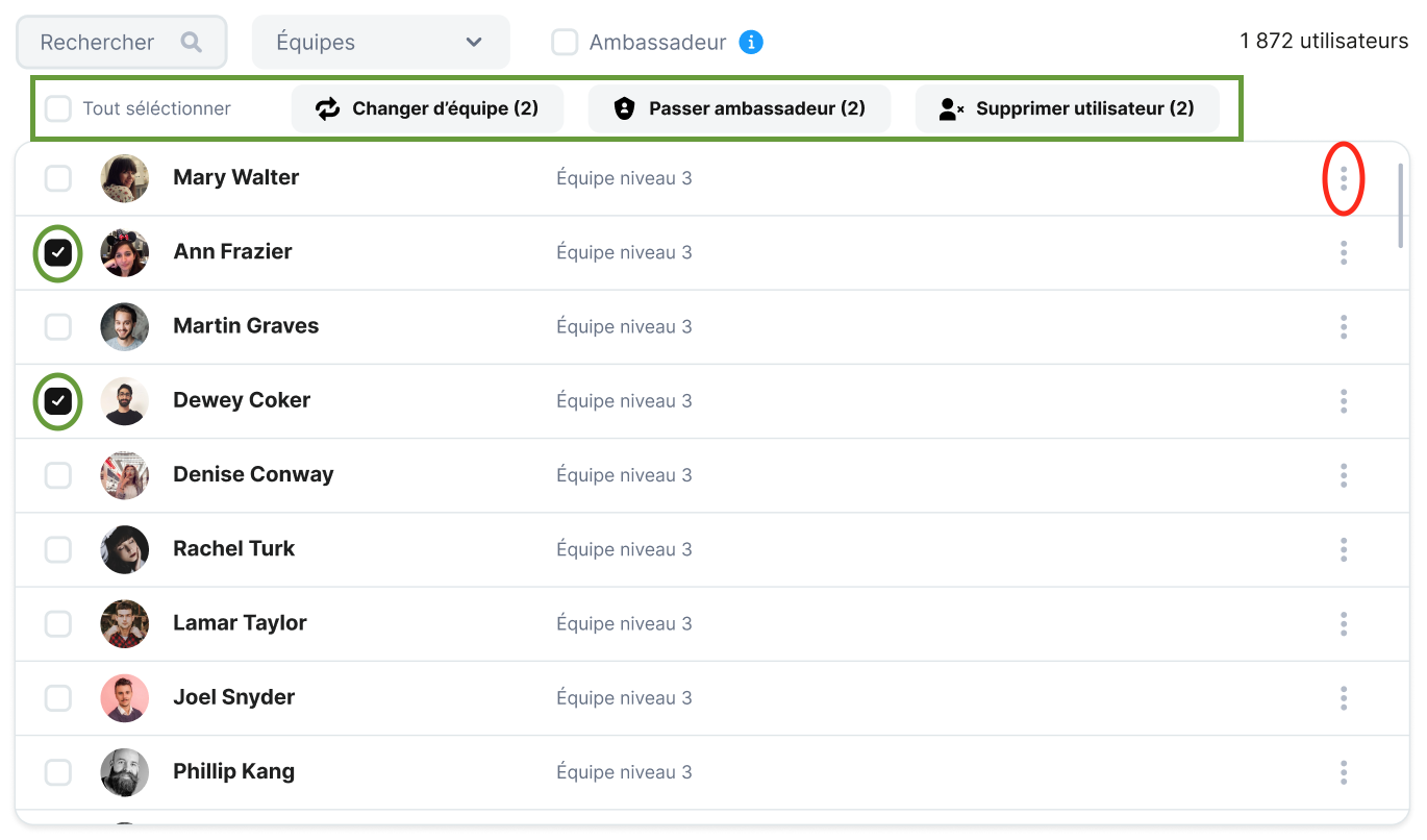 💡Si selecciona al menos dos usuarios (círculo verde), aparecerá una barra de opciones (rectángulo verde) con las mismas acciones presentadas anteriormente, excepto "Eliminar de su equipo".
